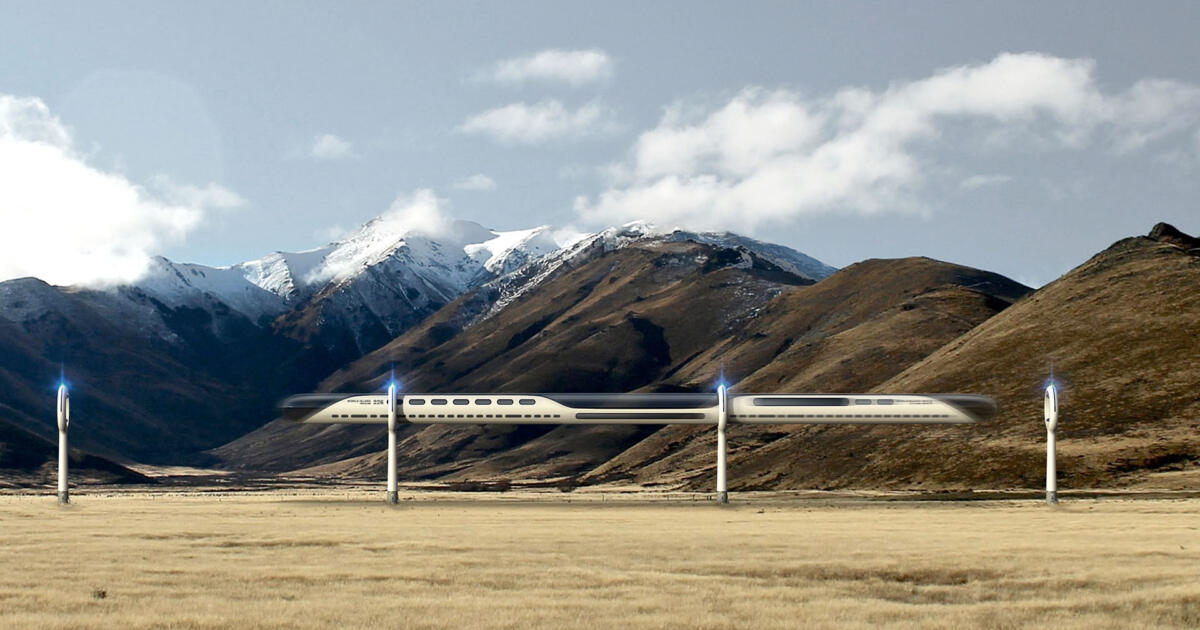 Der 250 Meter lange Zug soll 800 km/h schnell sein – ohne eigenen Antrieb an Bord. Für Vortrieb sorgen Magnetringe, die auf 20 Meter hohen Pylonen in der Landschaft thronen. Durch die zischt der Aeroslider berührungslos – ohne Schienen, Röhren oder andere physische Stabilisatoren.
