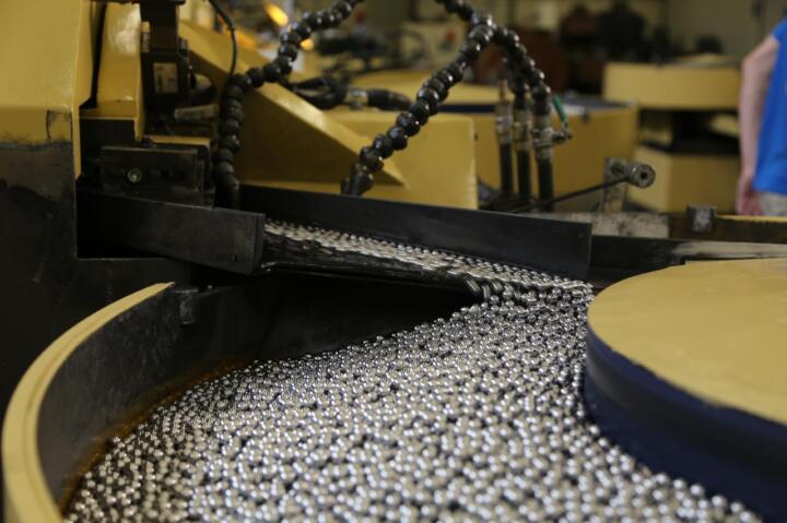 The perfect rolling element starts out as a steel wire. Wound on large rolls, the wire is placed on top of a ball press, fed into the machine, and cut off. Subsequently, two semi-spherical dies, pressing against each other with the force of about ten metric tons (11 short tons) give the wire sections the shape of a ball, resulting in a blank with a so-called Saturn ring and a pole. In the next step – de-flashing – these irregularities are removed and the ball becomes rounder. After that, the unfinished balls are hardened by heating them in a furnace and subsequently cooling them down again in oil. This arranges the atomic structure of the spheres in a way that makes them stronger. During grinding, pre- and post-lapping, the balls are machined using high-tech materials like ceramics or even diamond powder. For quality assurance, roundness and roughness are checked on randomly selected balls in special measuring rooms. This is followed by washing, a surface inspection – of every single ball – and finally by packaging.